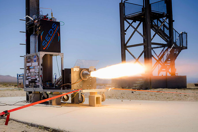 On a hot, dusty Friday evening in May, a caravan of five cars packed with UC San Diego students rolled onto FAR site in the Mojave Desert — a 10-acre property established by the Friends of Amateur Rocketry, Inc. to safely test and launch rockets. It took three tries, but the UC San Diego chapter of Students for the Exploration and Development of Space were able to successfully test the latest version of their 3-D-printed rocket engine.