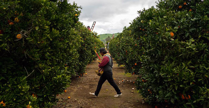 In an orange grove outside Exeter, California, workers climb aluminum ladders to pick fruit with expert speed. California produces 80 percent of the nation’s fresh oranges, tangerines and lemons, most of it in small Central California communities like these.