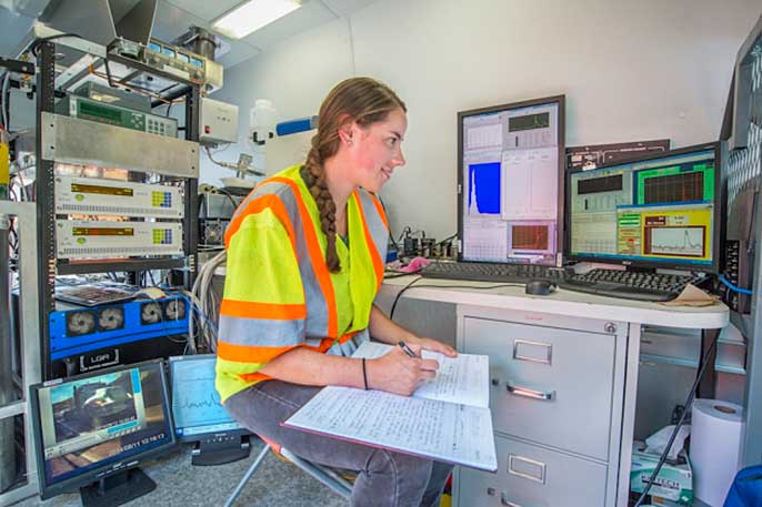 This summer Kirchstetter brought his research van to the Caldecott Tunnel, which connects Oakland to Contra Costa County, to measure emissions from a larger sampling of heavy-duty trucks. On a sunny weekday morning graduate student Chelsea Preble and undergraduate Troy Cados are in the van, having arrived at 6 a.m. to tune the instruments and catch the morning rush hour.