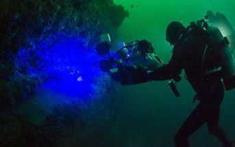 Researchers then went on a number of expeditions to Scripps Canyon in San Diego County, where they observed swellsharks in their native habitat, about 100-feet (30-meters) underwater. During night dives, the team stimulated biofluorescence in the sharks with high-intensity blue light arrays housed in watertight cases. The resulting underwater light show is invisible to the human eye. To record this activity, the researchers used custom-built underwater cameras with yellow filters, which block out the blue light, as well as the newly developed “shark-eye” camera to get a better idea of how the shark sees the underwater display.