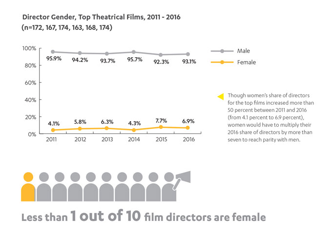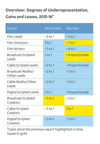 The study analyzed the casts of and talent behind the top 200 theatrical releases of 2016 and 1,251 broadcast, cable and digital platform television shows from the 2015–16 season.