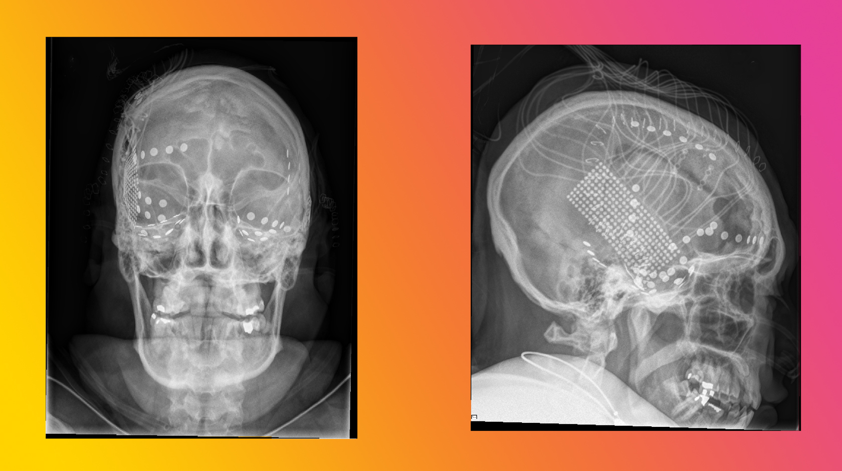 A head X-ray of one participant in the experiment shows the placement of electrodes over the frontal (top) and temporal (bottom) regions of the brain. These electrodes were placed on the surface of the brain to locate the origin points of epileptic seizures. While waiting for days in their hospital rooms, patients volunteered for other brain studies, including one attempting to pinpoint the brain regions that respond to music.