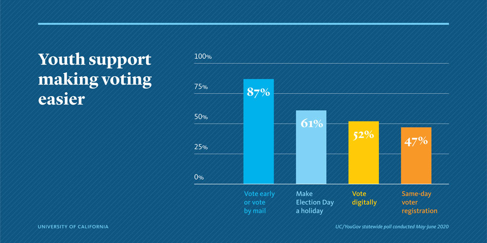 The poll, conducted by YouGov on behalf of UC, surveyed 1,000 18- to 24-year-olds between May 28 and June 5, 2020, to gain insights into their attitudes toward voting, civic engagement and the COVID-19 pandemic ahead of the 2020 election.