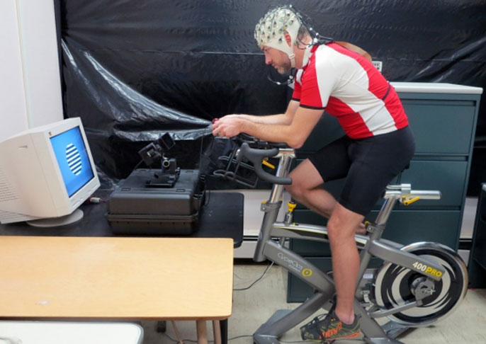 To investigate how exercise affects different aspects of cognitive function, the investigators enlisted 18 volunteers. Each of them wore a wireless heart rate monitor and an EEG (electroencephalogram) cap containing 64 scalp electrodes. While on a stationary bicycle, participants performed a simple orientation discrimination task using high-contrast stimuli composed of alternating black and white bars presented at one of nine spatial orientations. The tasks were performed while at rest and during bouts of both low- and high-intensity exercise.