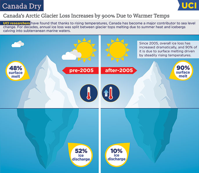 Ice loss from Canada’s Arctic glaciers has transformed them into a major contributor to sea level change, new research by University of California, Irvine glaciologists has found.
