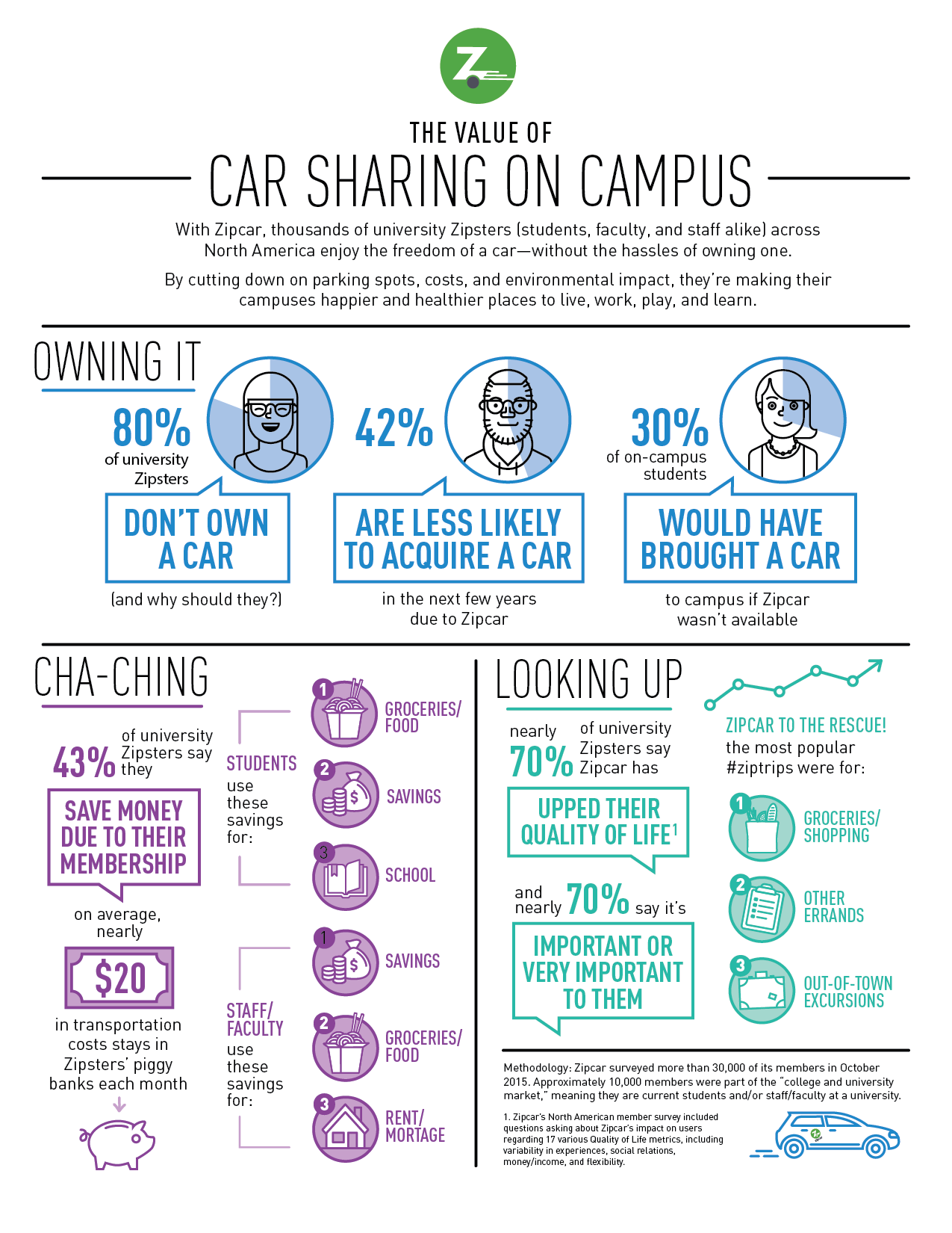 - The availability of car sharing allowed 30 percent of students who lived on campus to leave their personal cars at home.