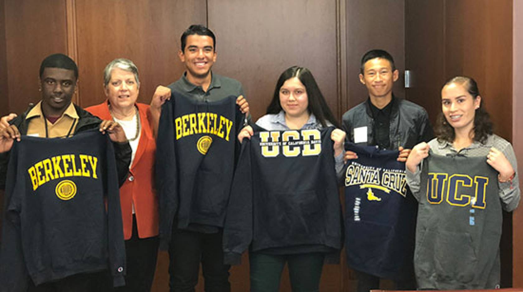 At a celebration lunch on Wednesday, Aug. 1, President Janet Napolitano awarded college scholarships through the Oakland Promise to five UC-bound Oakland students in recognition of their academic accomplishments and demonstrated commitment to their communities.