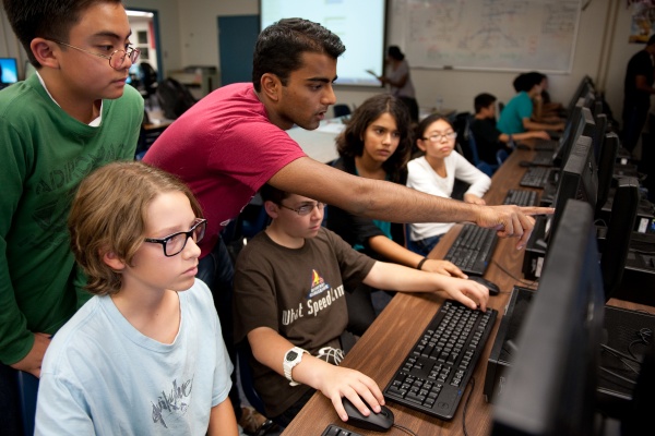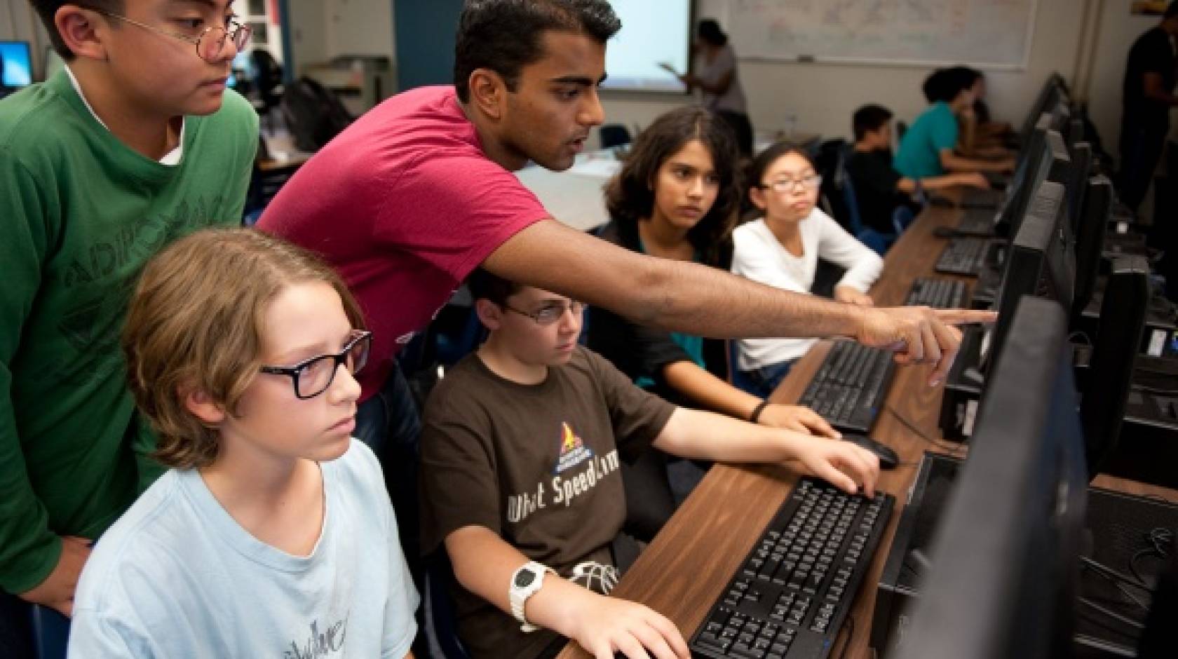 UCI business administration major Naren Sathiya (in red) assists students at Irvine's Rancho Middle School in an after-school mobile phone app competition against seventh- and eighth-graders from the Tiger Woods Learning Center in Anaheim.