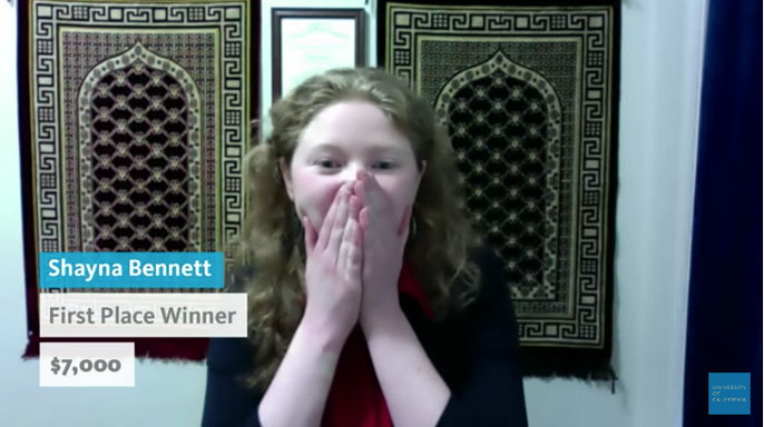 “This has been a dream since I first heard about this contest,” said an ecstatic Bennett, who spent years perfecting her winning presentation. She first participated in Grad Slam in 2019, finishing in the top 10. She was a runner-up in the 2020 contest before snagging first-place in UC Merced’s contest a few weeks ago. As the UC-wide winner, she received $7,000 in prize money and the coveted systemwide trophy, the “Slammy.”