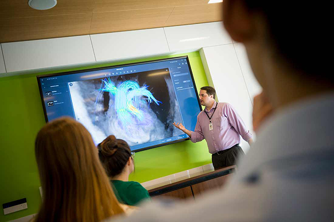 UC San Diego bioengineering professor Adam Engler describes a novel imaging technique created by engineers to capture blood flow in the heart.Credit: Erik Jepsen/UC San Diego Publications