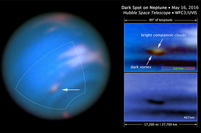 Starting in July 2015, bright clouds were again seen on Neptune and were subsequently observed by several telescopes. Observers wondered whether these clouds were large convective storms, or bright “companion clouds” following an unseen dark vortex. In September, the question was answered by the Outer Planet Atmospheres Legacy (OPAL) program, a long-term Hubble Space Telescope project that annually captures global maps of the outer planets. OPAL images revealed a dark spot close to the location of the bright clouds that had been tracked by ground-based observers, including amateurs and professional astronomers at the Keck Observatory in Hawaii.