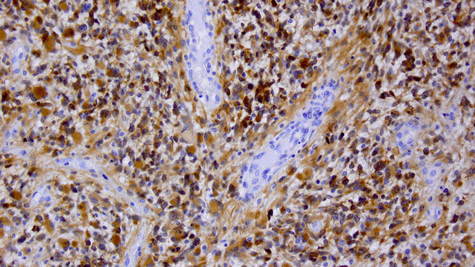 The destruction starts with a modification in the instructions that tell a single brain cell how to grow. As the cell rapidly multiplies into thousands of cancerous cells, an irregularly shaped tumor mass forms, with tendrils that invade deeper into healthy brain tissue. The tumor’s abnormal growth makes it hungry for more oxygen and nutrients, so it hijacks the circulatory system and forces new blood vessels to grow around it. It is resistant to radiation, and is protected by the brain-blood barrier—a series of defenses within blood vessel walls that protect the brain from toxic molecules, but also keep out cancer drugs that could kill the cancerous cells. Left to continue growing, it eventually destroys its host. This is the brain cancer glioblastoma multiforme.