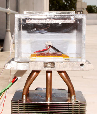The system Wang and her students designed consisted of more than two pounds of dust-sized MOF crystals compressed between a solar absorber and a condenser plate, placed inside a chamber open to the air. As ambient air diffuses through the porous MOF, water molecules preferentially attach to the interior surfaces. X-ray diffraction studies have shown that the water vapor molecules often gather in groups of eight to form cubes.