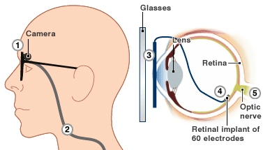 The retinal implant, picking up signals from a camera in a pair of sunglasses, sends electronic impulses up the optic nerve to the brain, which assembles them into an image.