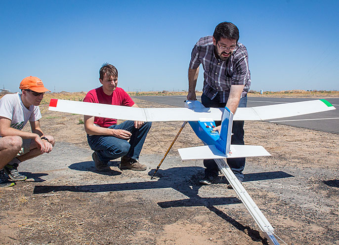 For one certification, Stark and Professor YangQuan Chen selected a fiberglass plane with a 7 ½-foot wingspan that flies for about 45 minutes at a stretch and can carry 2 pounds of scientific equipment, such as environmental sensors and cameras for this permit. They have authorization to launch from a site within a few miles of campus and can fly it up to 700 feet in the air.