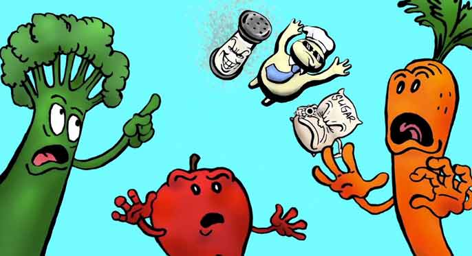 It depicts the nefarious adventures of three villains: "Psycho Sugar," "Sinister Salty," and the "Illsbury Doughboy." Together they go on a rampage, attacking organic vegetable stands and transforming fresh foods into junk food in an evil scheme to turn healthy food into empty calories.