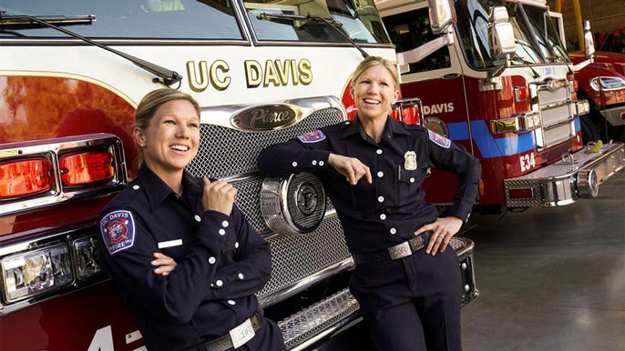 One of UC Davis Fire Department’s newest firefighters is Cara Martinez, who has been on the job for one year. Among her co-workers is her identical twin sister Meggie Elledge, who has been here two years.