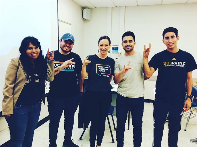 UC Irvine professor Anita Casavantes Bradford displays school spirit with her #FirstGenUCI students. Faculty who are the first in their family to go to college encourage other #FirstGen students to share their stories & support with #FirstGenUCI.