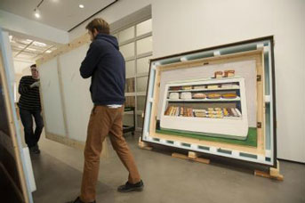 Museum Founding Director Rachel Teagle, Macarron-Bice and others were on hand Tuesday, Dec. 12, as preparators uncrated the first of more than 60 works that will eventually be part of Wayne Thiebaud: 1958-1968. The exhibition presents rarely exhibited works and new scholarship on this formative decade, a pivotal period of Thiebaud’s practice during which the artist worked his way from obscurity to national prominence. On display Jan. 16 through May 13, it is the first museum exhibition devoted to the emergence of Thiebaud’s mature works.