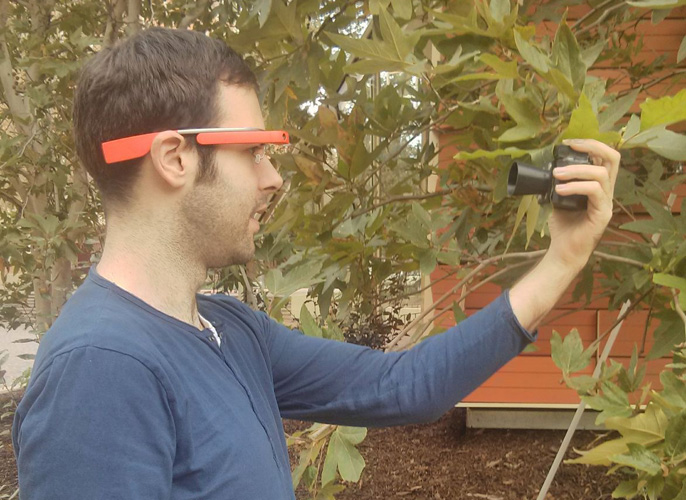 The wearer can control the device using the Google Glass touch control pad or with the voice command, “Okay, Glass, image a leaf.” The Glass photographs the leaf and sends an enhanced image wirelessly to a remote server, which processes the data from the image and sends back a chlorophyll concentration reading, all in less than 10 seconds.