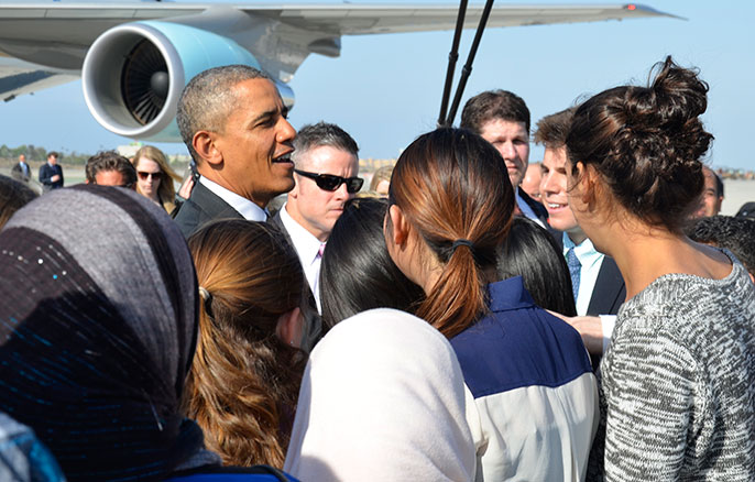 As with most Fiat Lux seminars, which provide students and faculty with small group settings to engage in meaningful discussions on a range of topics, this one hasn't disappointed: On Wednesday (May 7), the 18 students in the course had a chance to meet President Obama on the tarmac at LAX as he got off Air Force One.