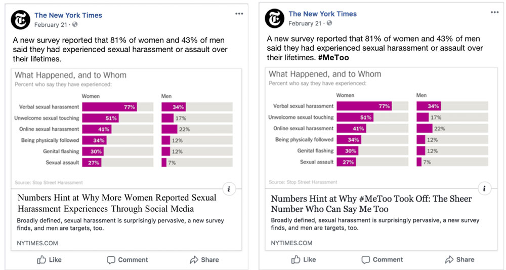 We tested whether people responded differently to the presence or absence of political hashtags — particularly the most widely used #MeToo and #BlackLivesMatter — in news articles published on Facebook by major news outlets, such as The New York Times and NPR.