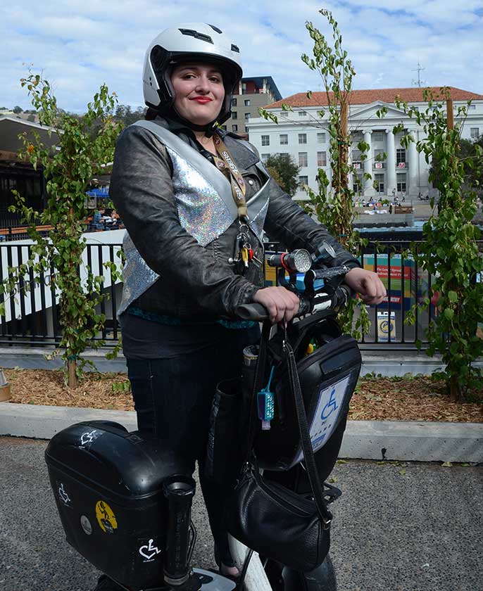 On her way to class or voter-engagement events, Funes is hard to miss. At the age of 10, she was diagnosed with a brain tumor; after numerous surgeries, she remained paralyzed on one side. Today she navigates atop a two-wheeled Segway that brings her to 6’3″ — which she calls “my real height, not 5’4″.