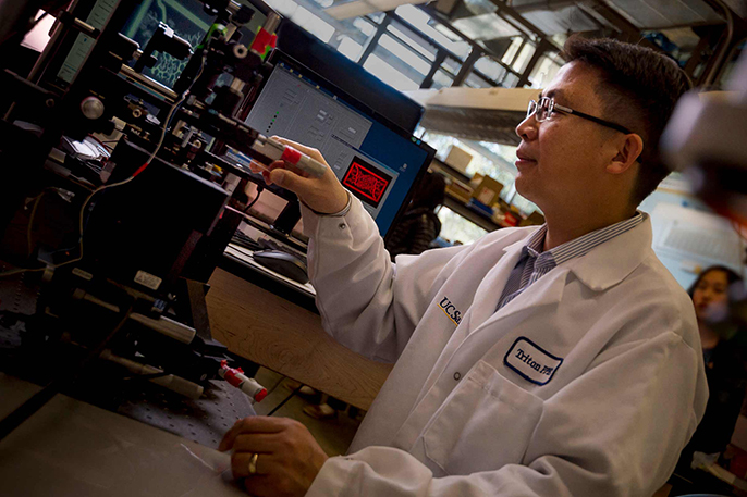 “We can directly print detailed microvasculature structures in extremely high resolution. Other 3-D printing technologies produce the equivalent of ‘pixelated’ structures in comparison and usually require sacrificial materials and additional steps to create the vessels,” said Wei Zhu, a postdoctoral scholar in Chen’s lab and a lead researcher on the project.