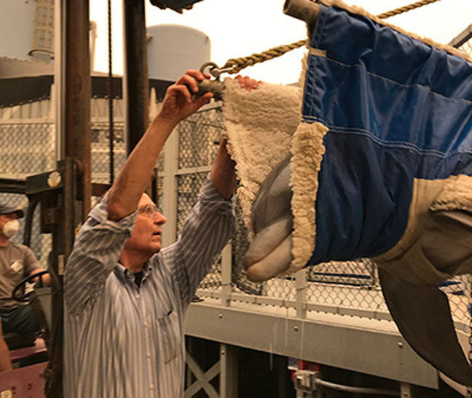 Moving the dolphins (Donley and Rain) and the Hawaiian monk seal (Kekoa), each weighing over 400 pounds, posed bigger logistical challenges. Williams said she was impressed when trainer Beau Richter convinced Kekoa to haul out of his pool, slide across the deck, and scooch down a ramp into a large cage.