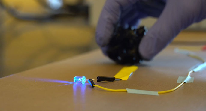 Victor Hernandez, from Los Angeles, a first-year grad student, is responsible for characterizing the materials and figuring out ways to make them more mechanically resilient and electrically conductive. Kiana Shirzad, a second-year grad student from Iran, is combining materials to create properties not observed in either of the original components.