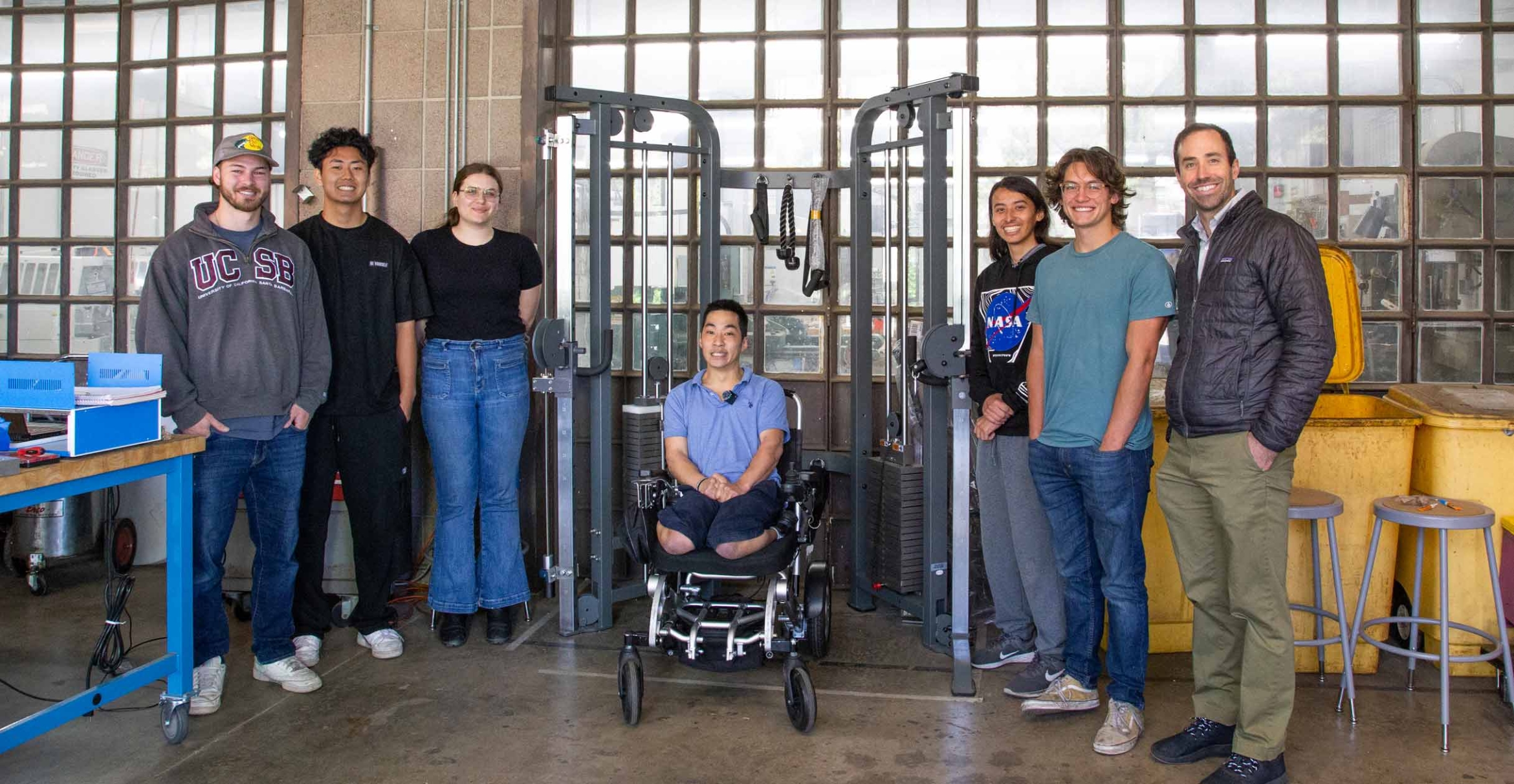 And now, in partnership with UC Santa Barbara, he’s working on a weight machine that will be accessible to everyone. Five senior undergraduate students in the Mechanical Engineering Department — Joseph Byun, Janna Crocker, Cannon Crow, James Freda and Carlos Rivera — teamed with Ferreira to adapt a standard pulley-and-cable weight machine to be accessible to people with disabilities, including those who use wheelchairs. The innovative capstone project will be presented along with 25 others at the 2023 Engineering Capstone Expo, to be held at 1:30 p.m. Friday, June 9, at Campbell Hall on the UCSB campus.