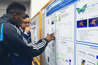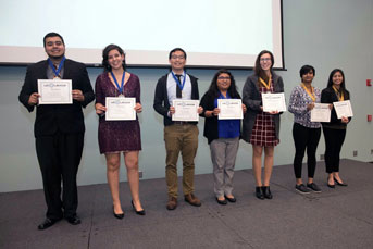 The highlight of the academic year for the program’s participants, the symposium represents months, if not years, of research conducted by the undergrads with the guidance of a faculty advisor and grad student mentors. The topics presented at the event spanned a wide range of disciplines, as the students discussed the cutting-edge science and emerging phenomena that in many cases inspired them to embark on a life of research: black holes, human-robot interactions, gene editing, attention and memory in a smartphone world, to name just a few. They came prepared and eager to discuss the research summarized in the poster presentations that took up the first half of the day.