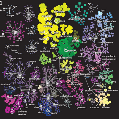 The results are presented in multicolored, multidimensional maps showing the more than 1,700 visual categories and their relationships to one another. Categories that activate the same brain areas have similar colors. For example, humans are green, animals are yellow, vehicles are pink and violet and buildings are blue. For more details about the experiment, watch the video above.