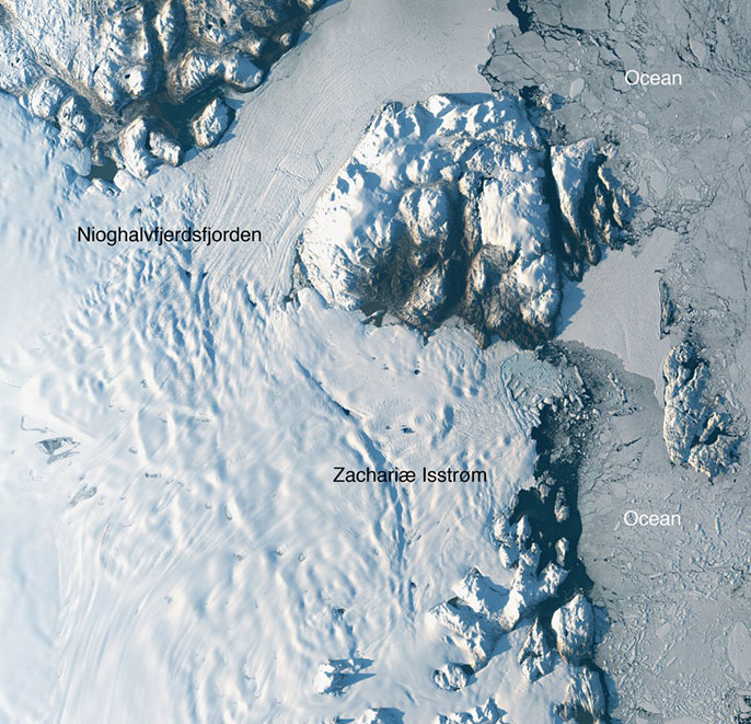 Zachariae Isstrom neighbors another large glacier, this one named Nioghalvfjerdsfjorden, that also is melting rapidly but is receding at a slower rate because it’s protected by an inland hill. The two glaciers make up 12 percent of the Greenland ice sheet and would boost global sea levels by more than 39 inches if they fully collapsed.
