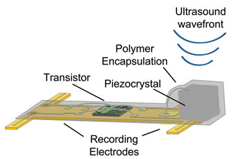 The sensors, which the researchers have already shrunk to a 1 millimeter cube – about the size of a large grain of sand – contain a piezoelectric crystal that converts ultrasound vibrations from outside the body into electricity to power a tiny, on-board transistor that is in contact with a nerve or muscle fiber. A voltage spike in the fiber alters the circuit and the vibration of the crystal, which changes the echo detected by the ultrasound receiver, typically the same device that generates the vibrations. The slight change, called backscatter, allows them to determine the voltage.