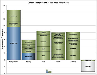 The study, published online, found that transportation is the largest source of emissions by Bay Area households (33 percent), followed by food (19 percent), goods (18 percent), services (18 percent), heating fuels (5 percent), home construction (3 percent), electricity (2 percent) and waste (1 percent). In some areas, food accounts for over one-third of emissions.