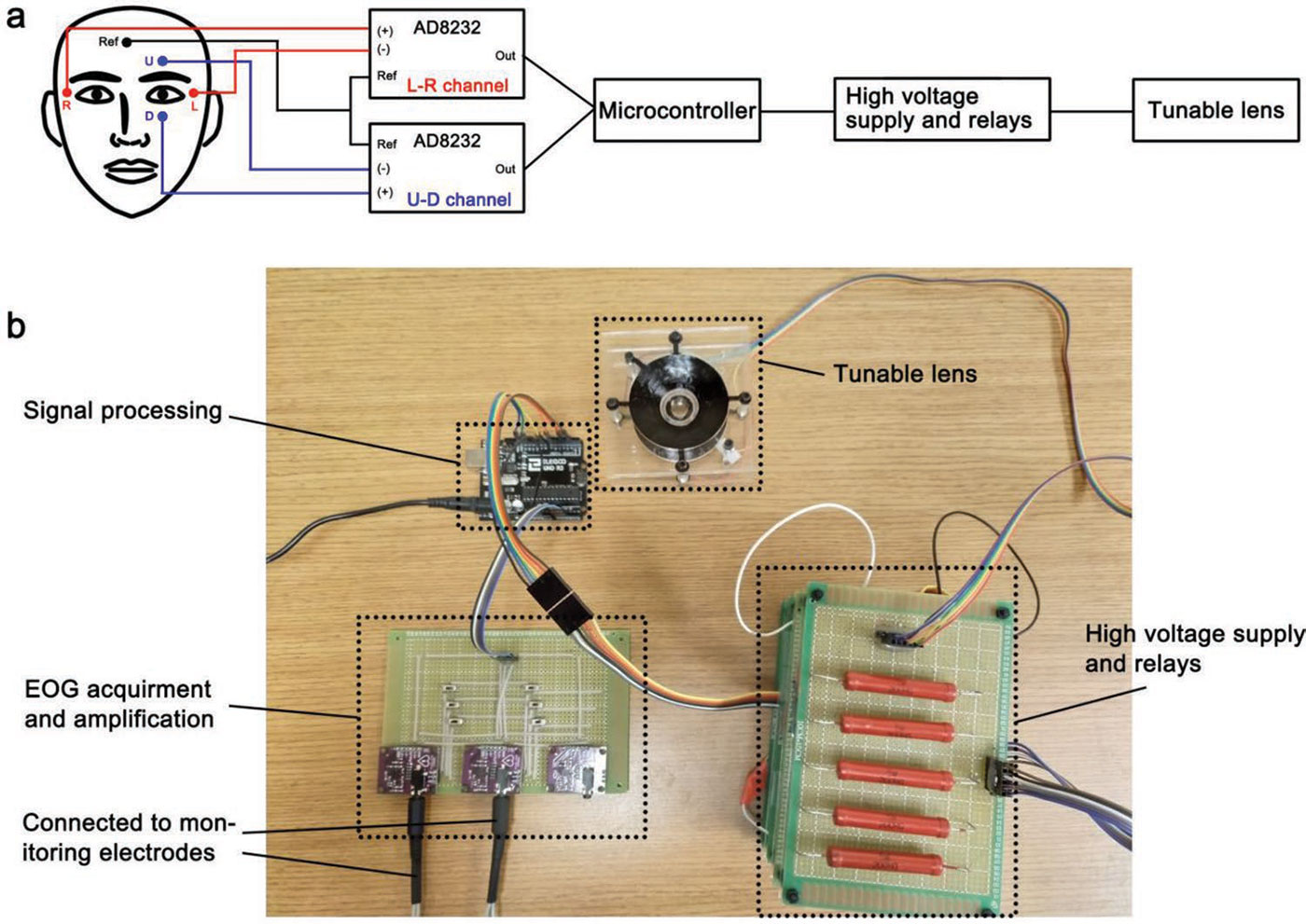 The prototype system responds to the electric signals generated around the eyes during movement, called electrooculographic signals. Patches of electrodes placed on the skin around the eyes measure these signals and transmit them through a signal processor to the lens.