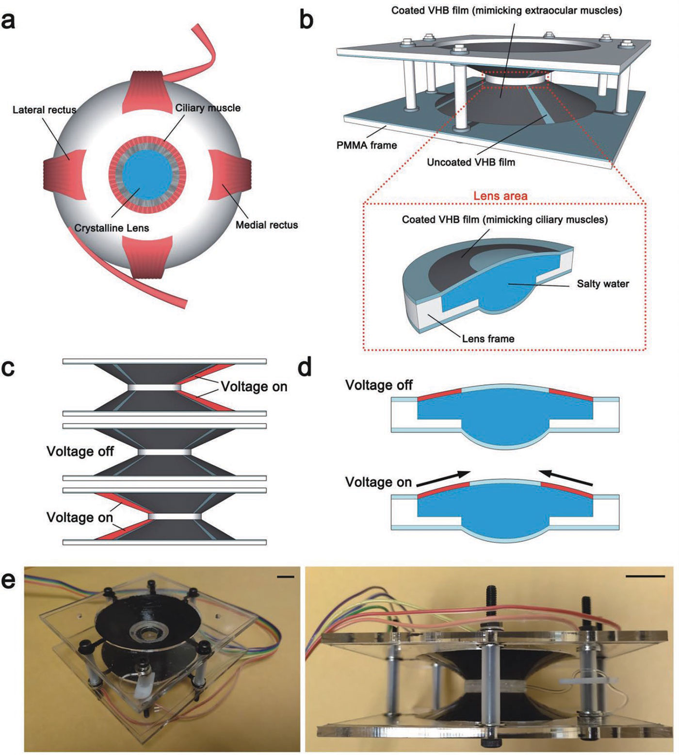 The system is designed to mimic how the human eye works. The lens itself is made up of salt water encased within two electroactive elastomer films that act like muscles. They can expand, contract, or change their structure when an electrical potential is applied. This enables the lens to look in four directions and change its focal point. Because the lens is made of soft materials, it can change its focal length by as much as 32 percent.