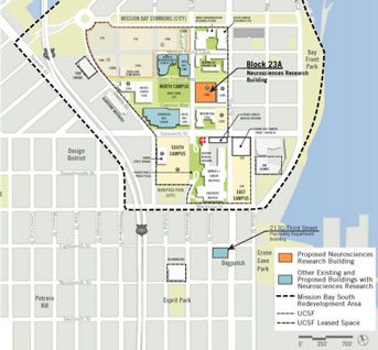 Combined with the nearby Sandler Neurosciences Center and Arthur and Toni Rembe Rock Hall, the neuroscience complex at UCSF Mission Bay will become one of the largest in the world. The building will be constructed on the current site of a parking lot on Block 23A, which is just north of Mission Hall, between Campus Way and Gene Friend Way and between Fourth Street and the Third Street Garage.