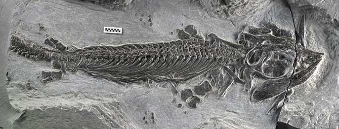 The fossil represents a missing stage in the evolution of ichthyosaurs, marine reptiles from the Age of Dinosaurs about 250 million years ago. Until now, there were no fossils marking their transition from land to sea.