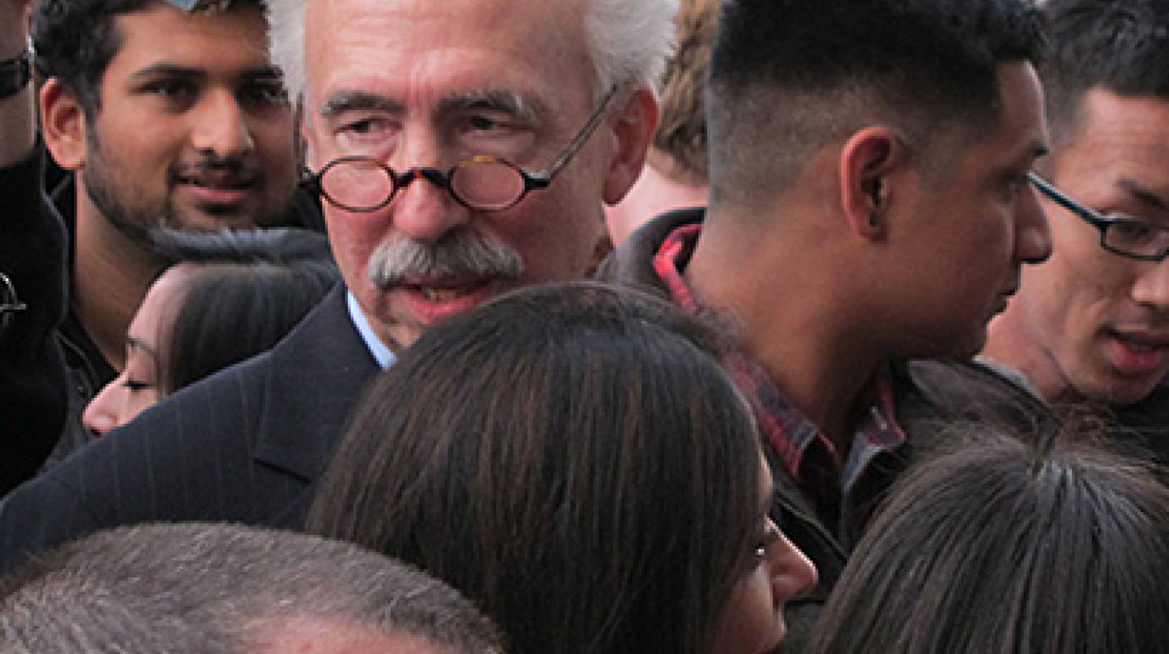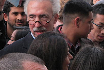 Formalities over, Dirks and Bakhle visited the Berkeley campus for a a private reception in the Morrison Library, followed by a public celebration outside the library, where hundreds of students, staff and faculty gathered to get their first glimpse of the next chancellor. A dozen students in blue-and-gold sweatshirts crowded the front, and the Cal Band lurked out of view, waiting for its chance. A few protest placards were in evidence, but the crowd was quiet and eager to hear from Dirks.