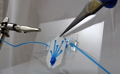 Graduate students Siyuan Xing and Jia Jiang developed a new textile microfluidic platform using hydrophilic (water-attracting) threads stitched into a highly water-repellent fabric. They were able to create patterns of threads that suck droplets of water from one side of the fabric, propel them along the threads and expel them from the other side.