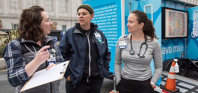 They partnered with Lava Mae, a San Francisco-based nonprofit that provides mobile showers and toilets for people experiencing homelessness. The team sets up shop near the showers, and visits with those who come to them for advice.