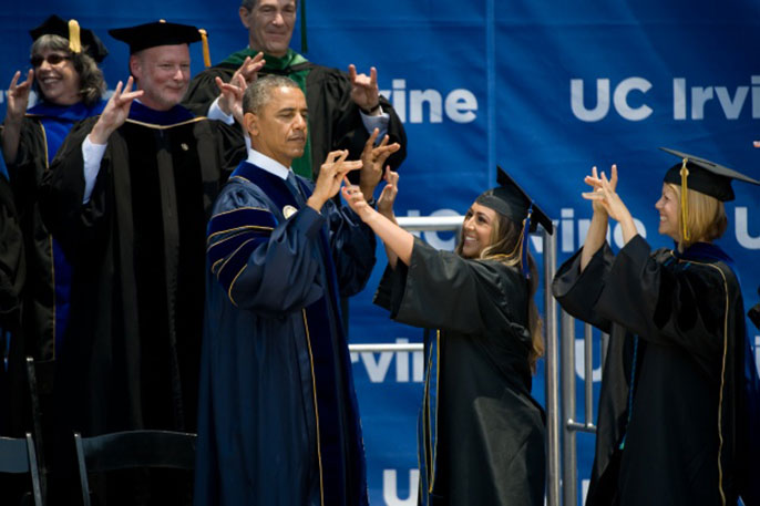 Both women are the first in their families to earn university degrees. Along with M.F.A. graduate Melissa McCann, who sang the national anthem, they gave Obama his first lesson in Anteater spirit, teaching him how to make the “Zot!” gesture.