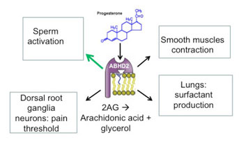 That proved to be the case. They showed that progesterone actually binds to a previously mysterious enzyme called ABHD2, which is found at high levels in sperm. Once progesterone binds to the enzyme, which sits on the surface of the sperm, it removes a lipid (2AG) that has been inhibiting the calcium channel. Released of inhibition, CatSper opens the gate to calcium ions and eventual sperm activation.