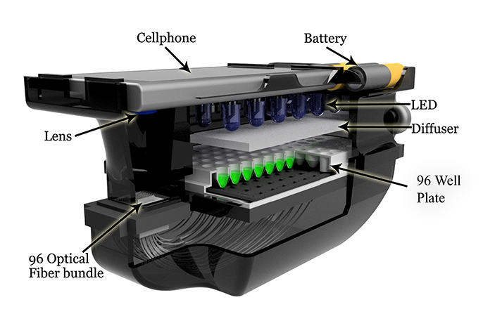 The UCLA device connects to a smartphone and has a plate that can hold up to 96 wells for testing. An array of LEDs illuminates the sample and then the phone’s camera is used to sense small changes in light transmission of each well containing a different dose selected from a panel of antibiotics. Images are sent to a server to automatically perform antimicrobial susceptibility testing and the results are returned to the smartphone in about one minute.