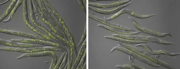 The researchers studied how roundworms (>C. elegans) regulate expression of genes that are turned on by infection with microsporidia, which are natural intracellular pathogens of worms as well as humans.