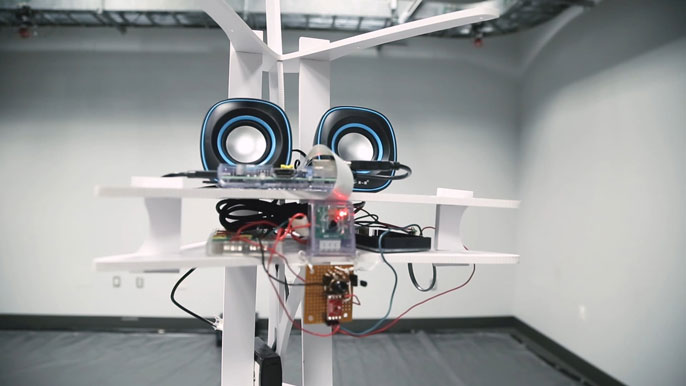 With a Roomba (sans vacuum) as its feet, a Raspberry Pi as its brain and an Arduino acting as a nervous system, Rover is more than an artistic endeavor, however. It is also a tool for investigating the ways humans respond to robots.