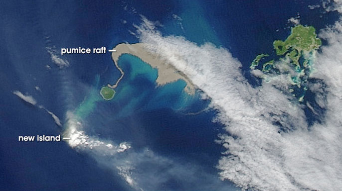 Underwater volcano eruptions are not as easy to track down as eruptions on land, and floating pumice spotted by a passenger on a commercial aircraft actually helped researchers track down the source of a major underwater eruption that occurred in 2012 and motivated the research expedition. Pumice stones spewed from underwater volcano eruptions vary widely in size but can typically be about the size of an apple, while pumice stones from volcanoes on land tend to be smaller than a golf ball.