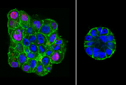Throughout a woman’s life, breast tissue grows, shrinks and shifts in a highly organized way in response to changes in her reproductive cycle. For instance, when forming acini, the berry-shaped structures that secrete milk during lactation, healthy breast cells will rotate as they form an organized structure. And, importantly, the cells stop growing when they are supposed to.